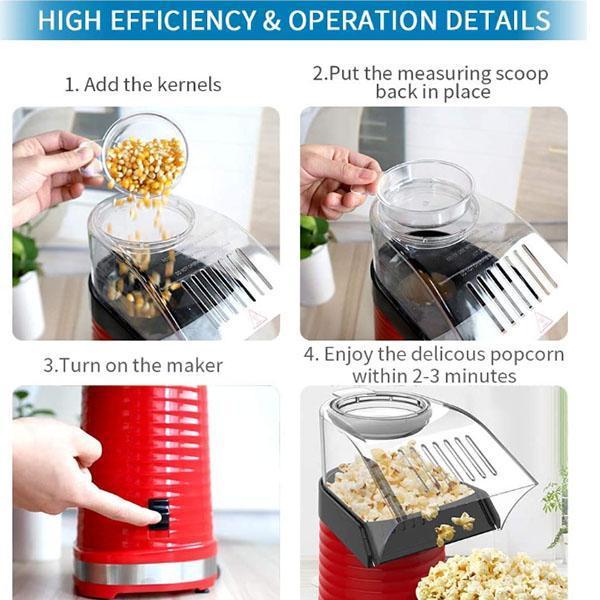 Add popcorn kernels to the large capacity heating chamber with a measuring cup, plug it in, and press the switch. In 2-3 minutes, you'll have fresh popcorn.