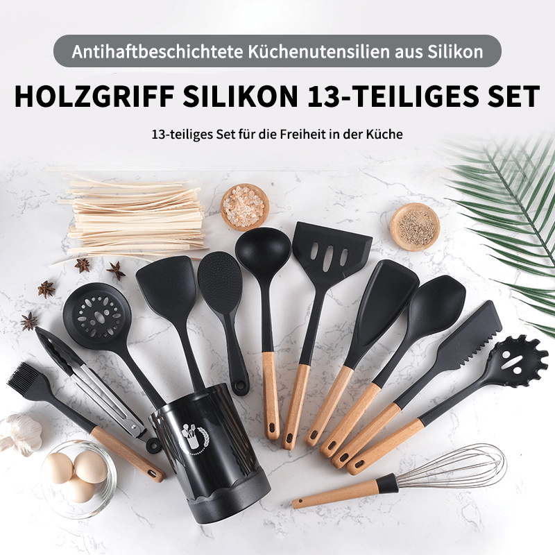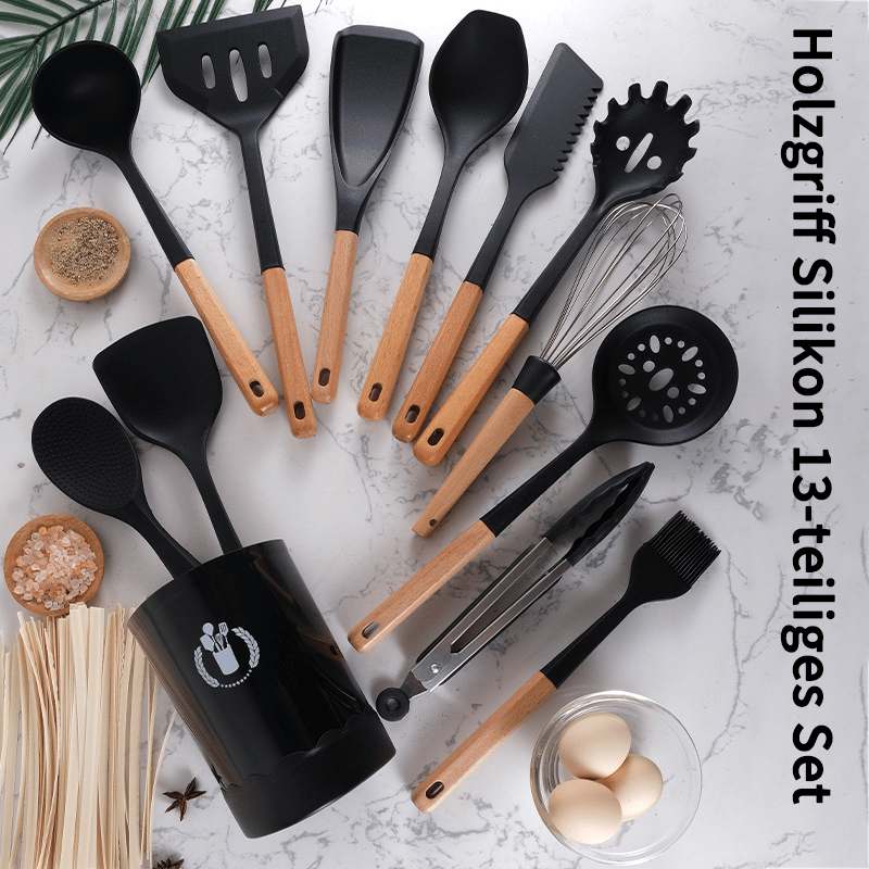 Beautiful and ergonomic, carefully shaped to lie comfortably in the hand, so you can effortlessly stir stews, skim soups and turn steaks. Each tool is made of ultra-durable matte black silicone that is heat resistant and can be safely used on all cooking surfaces, including non-stick coatings. The elegant silicone is complemented by chic acacia wood handles, each with a unique wood grain pattern. Their practical hanging loops also provide easy storage space.