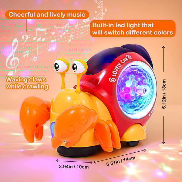 [Wheels for Both Floor and Carpet] There is a universal wheel at the bottom and it enables this crawling baby toy to crawl both on floor and carpet and it will change route when come across with obstacles. It crawls slowly in a small circle route so that babies can keep up with it.